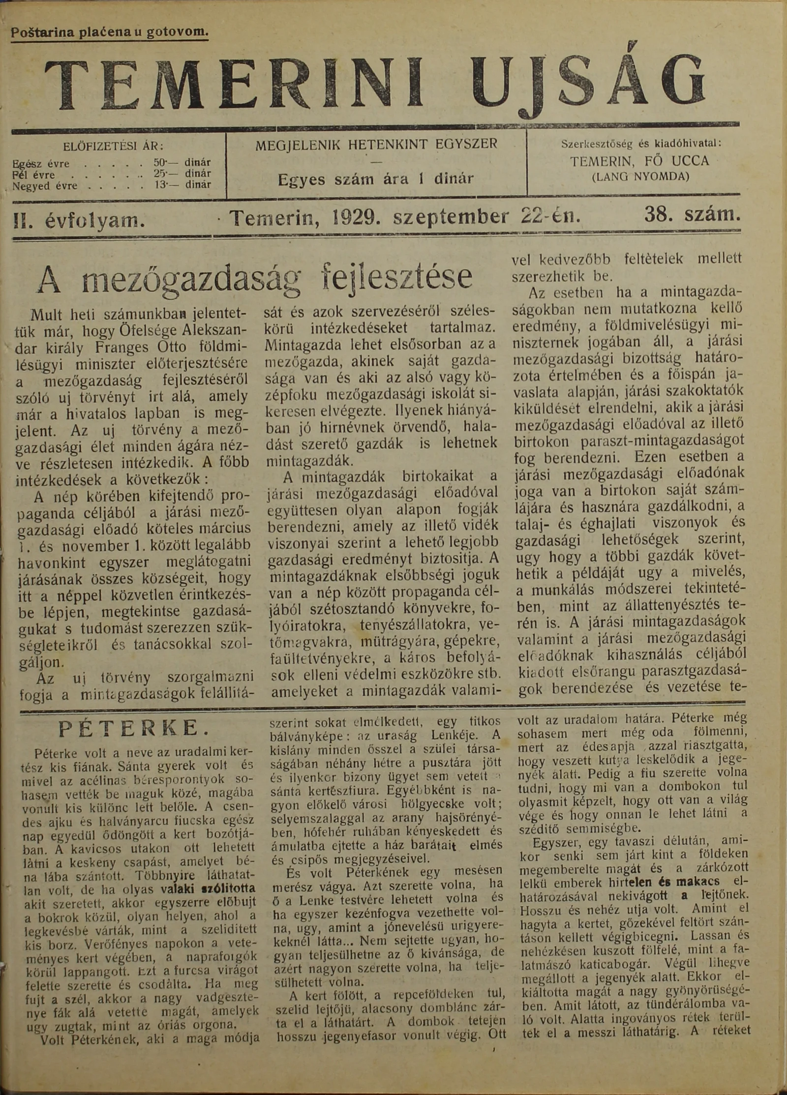 Temerini Újság 1928-1944, 2. évf. 1929. szeptember 22. 38. sz.