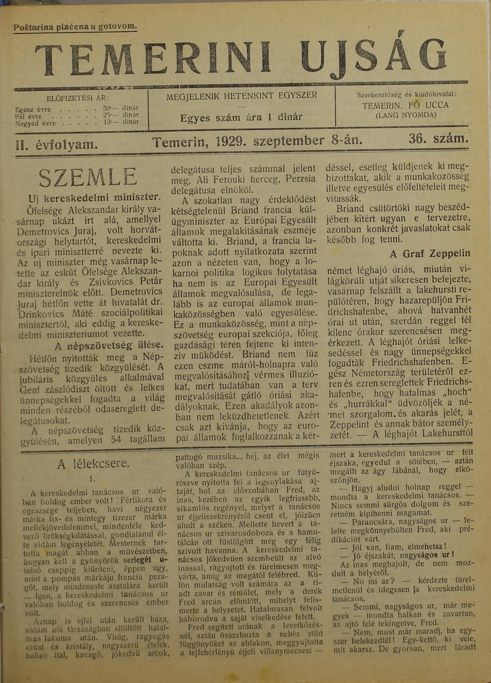 Temerini Újság 1928-1944, 2. évf. 1929. szeptember 8. 36. sz.