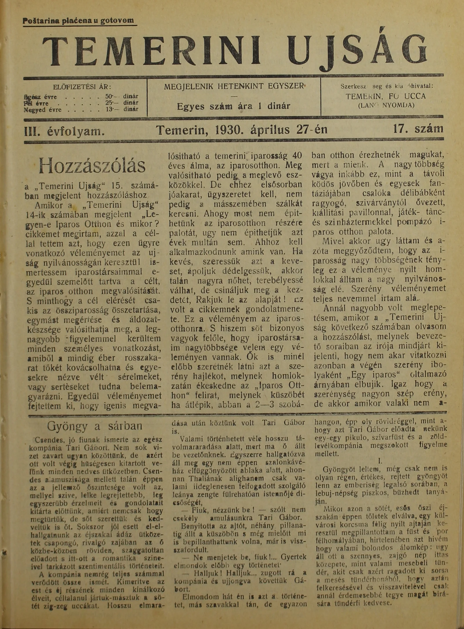 Temerini Újság 1928-1944, 3. évf. 1930. április 27. 17. sz.