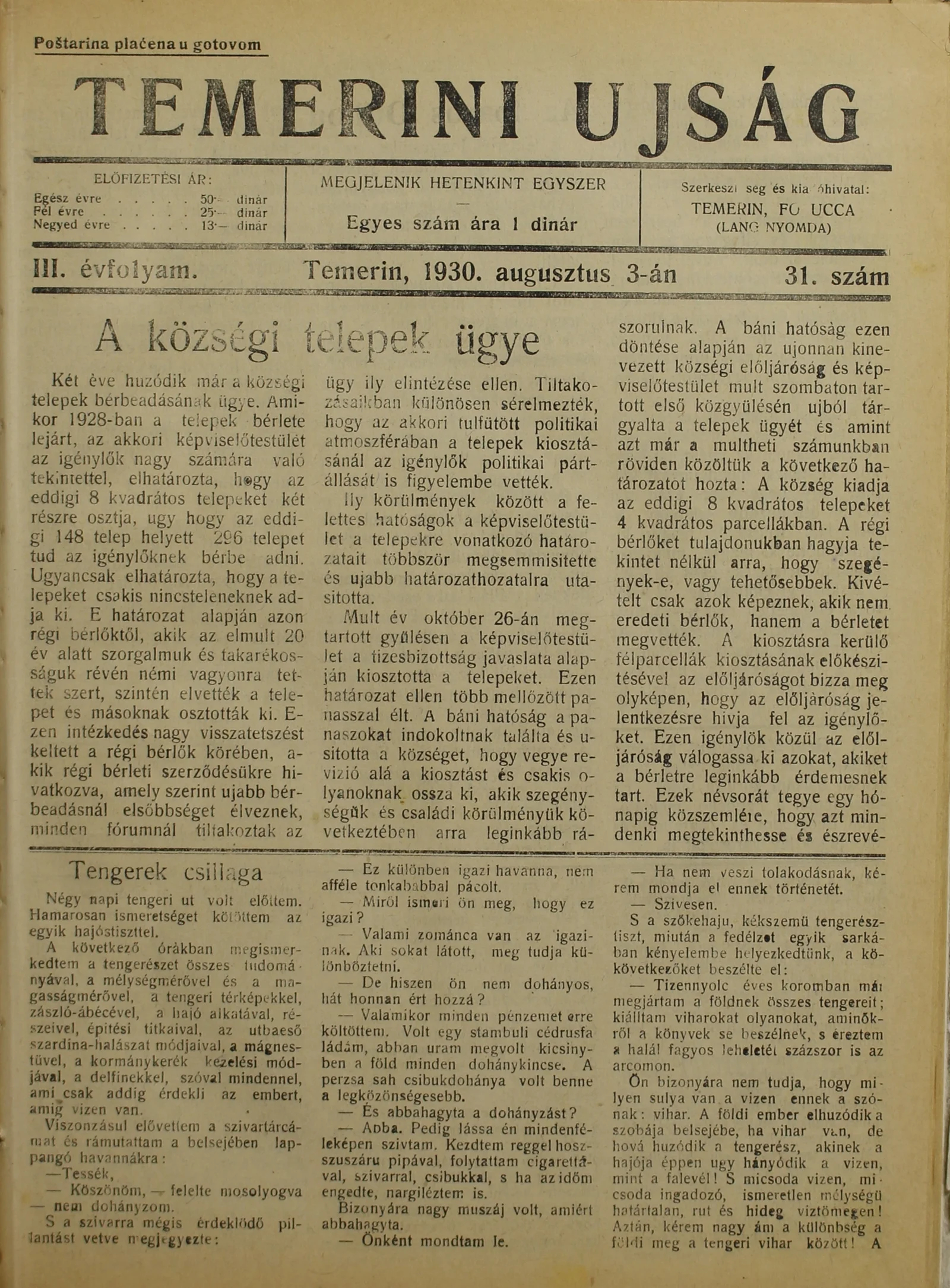 Temerini Újság 1928-1944, 3. évf. 1930. augusztus 3. 31. sz.