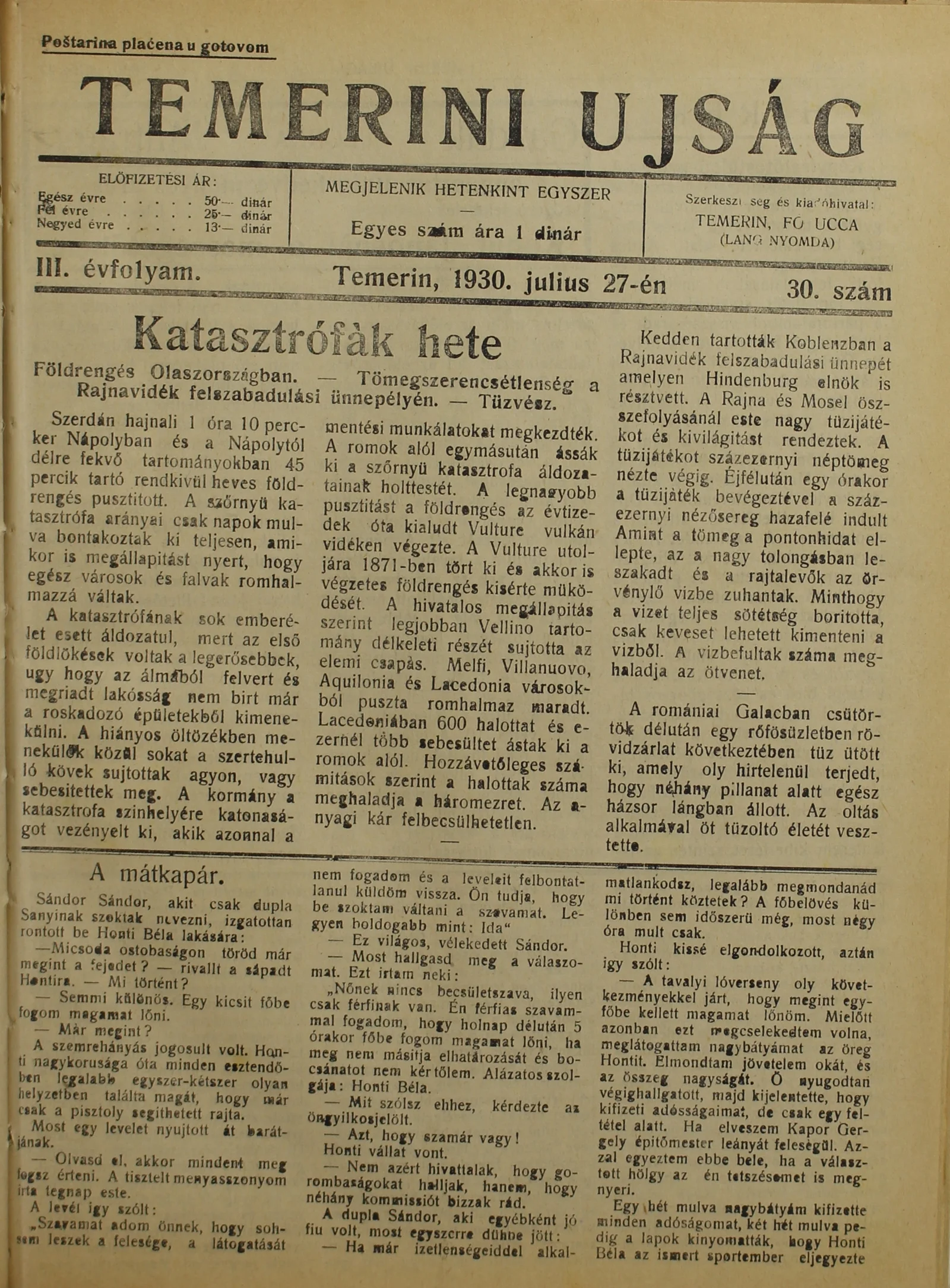 Temerini Újság 1928-1944, 3. évf. 1930. július 27. 30. sz.