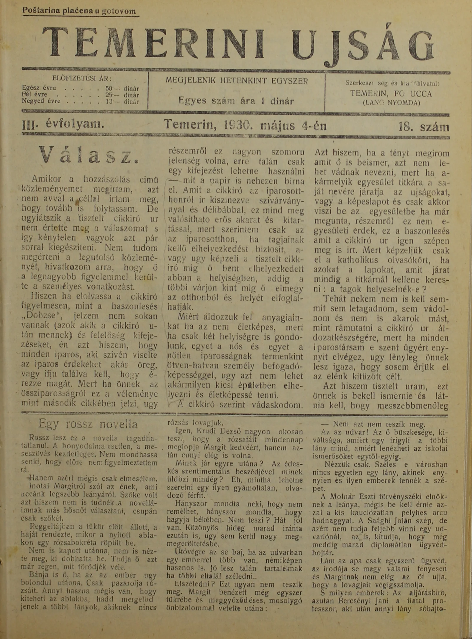 Temerini Újság 1928-1944, 3. évf. 1930. május 4. 18. sz.