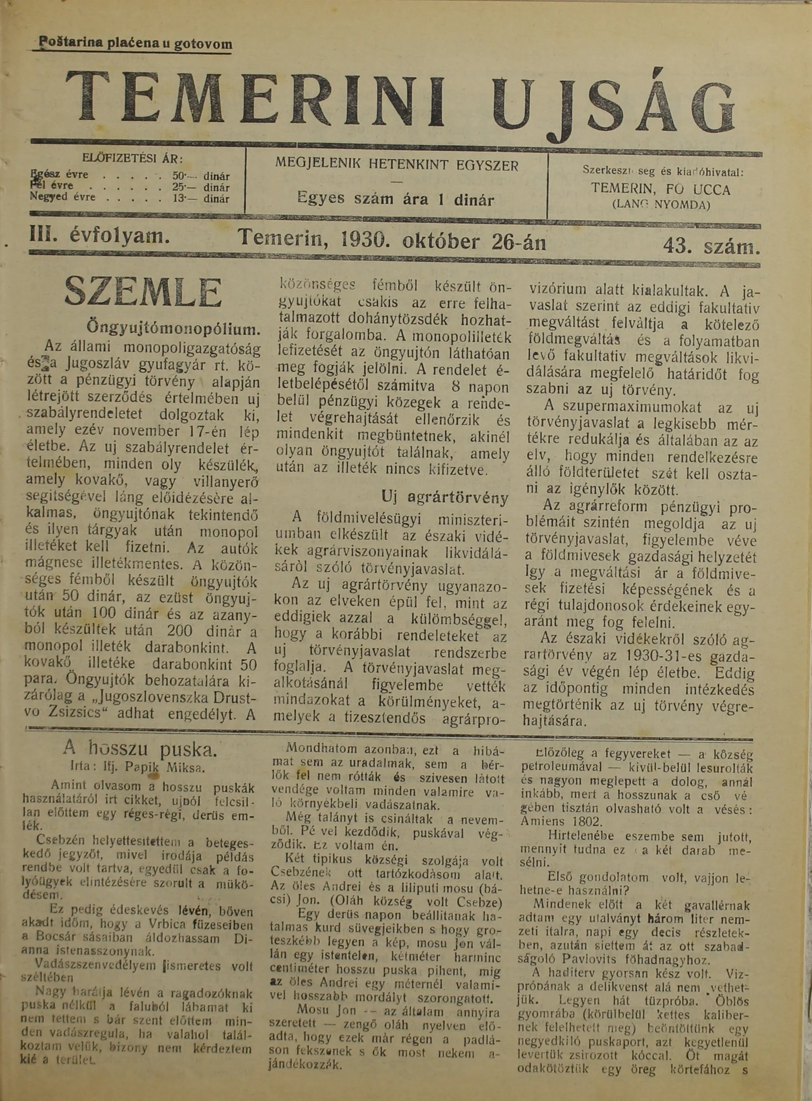 Temerini Újság 1928-1944, 3. évf. 1930. október 26. 43. sz.