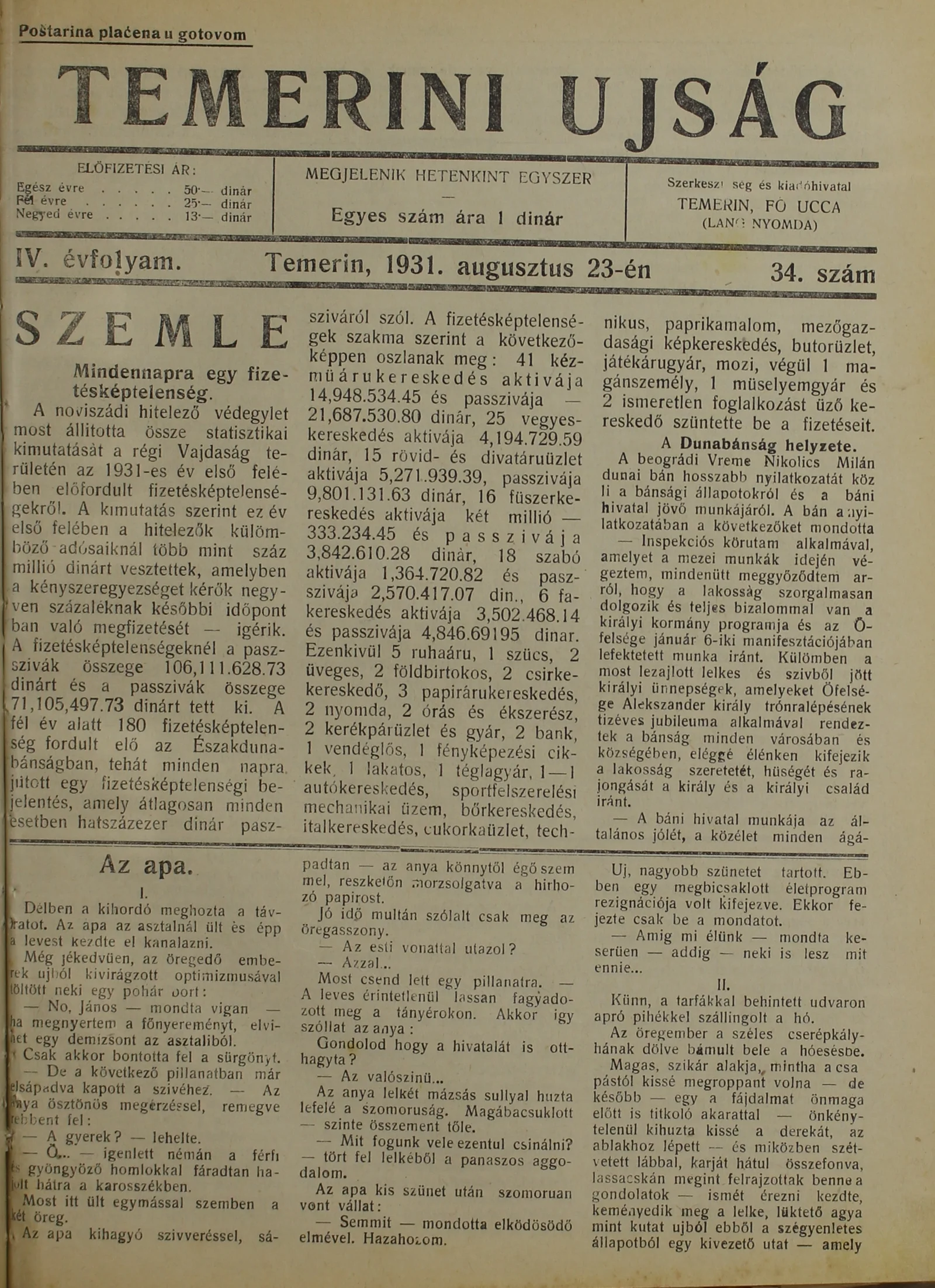 Temerini Újság 1928-1944, 4. évf. 1931. augusztus 23. 34. sz.
