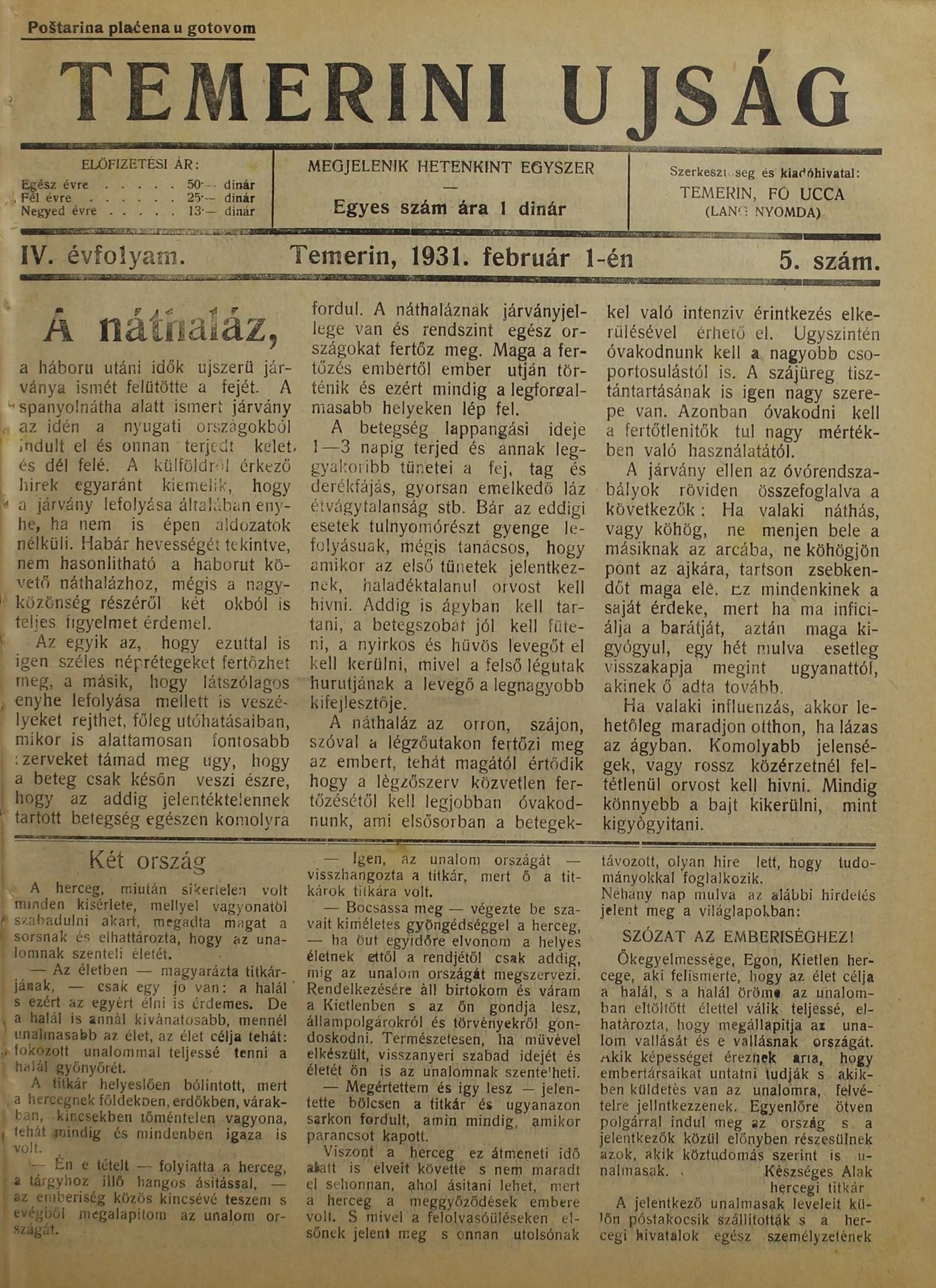 Temerini Újság 1928-1944, 4. évf. 1931. február 1. 5. sz.