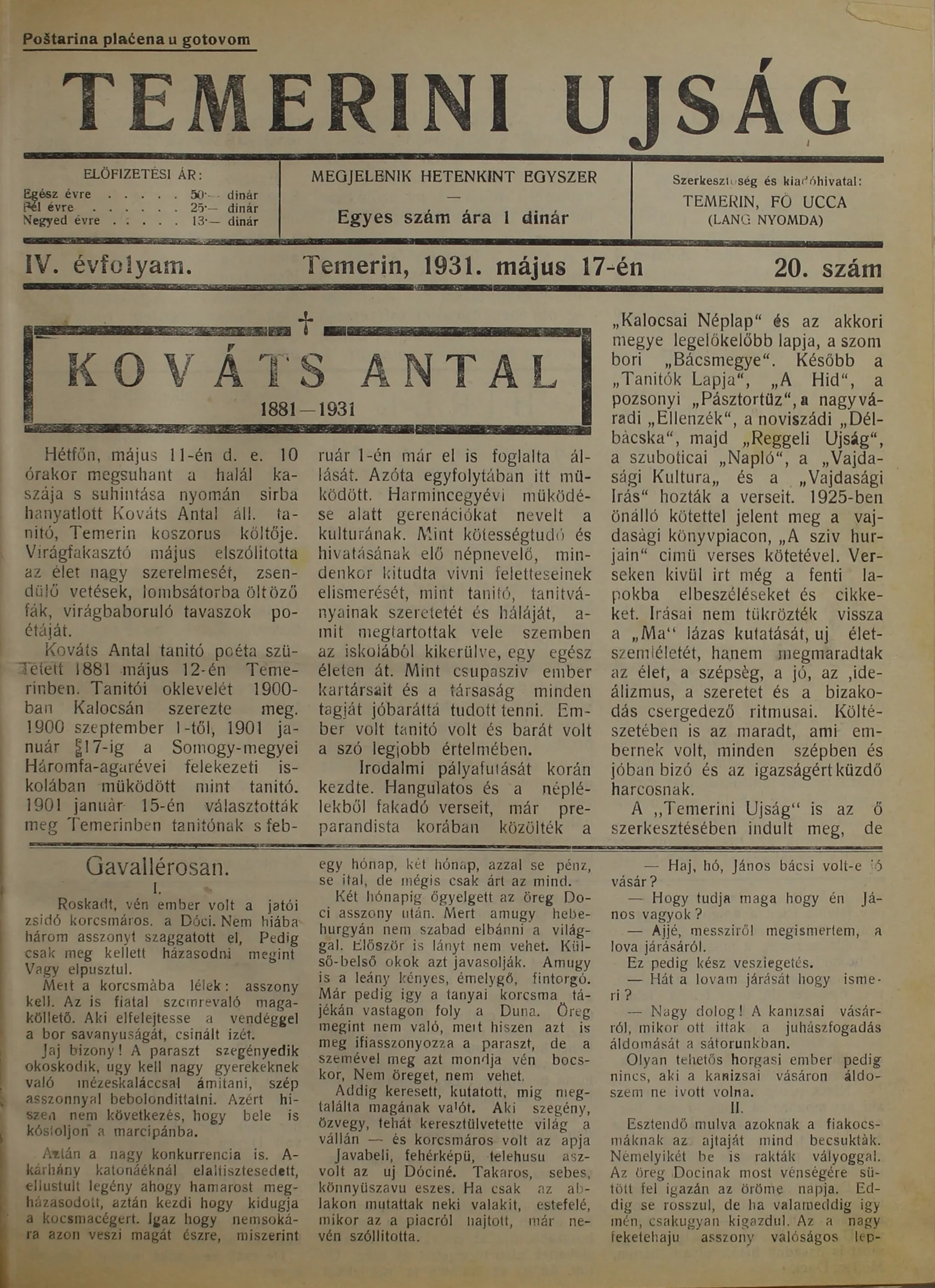 Temerini Újság 1928-1944, 4. évf. 1931. május 17. 20. sz.