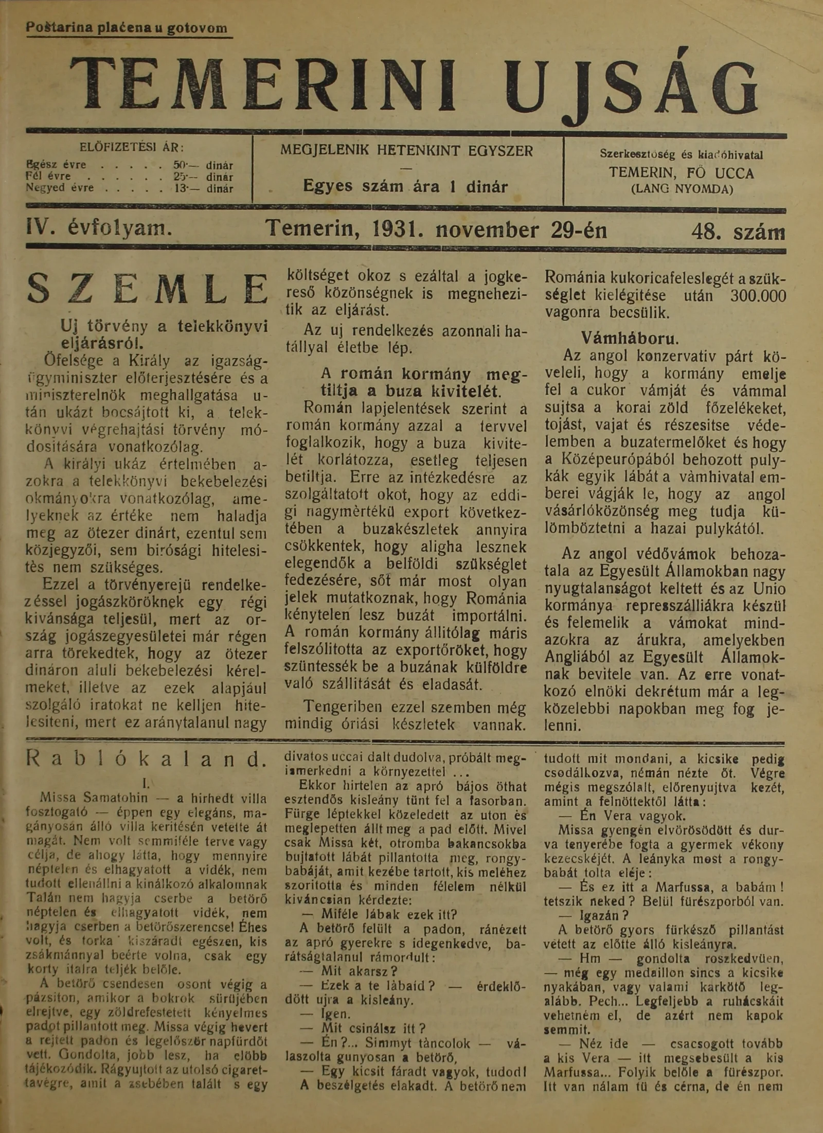 Temerini Újság 1928-1944, 4. évf. 1931. november 29. 48. sz.