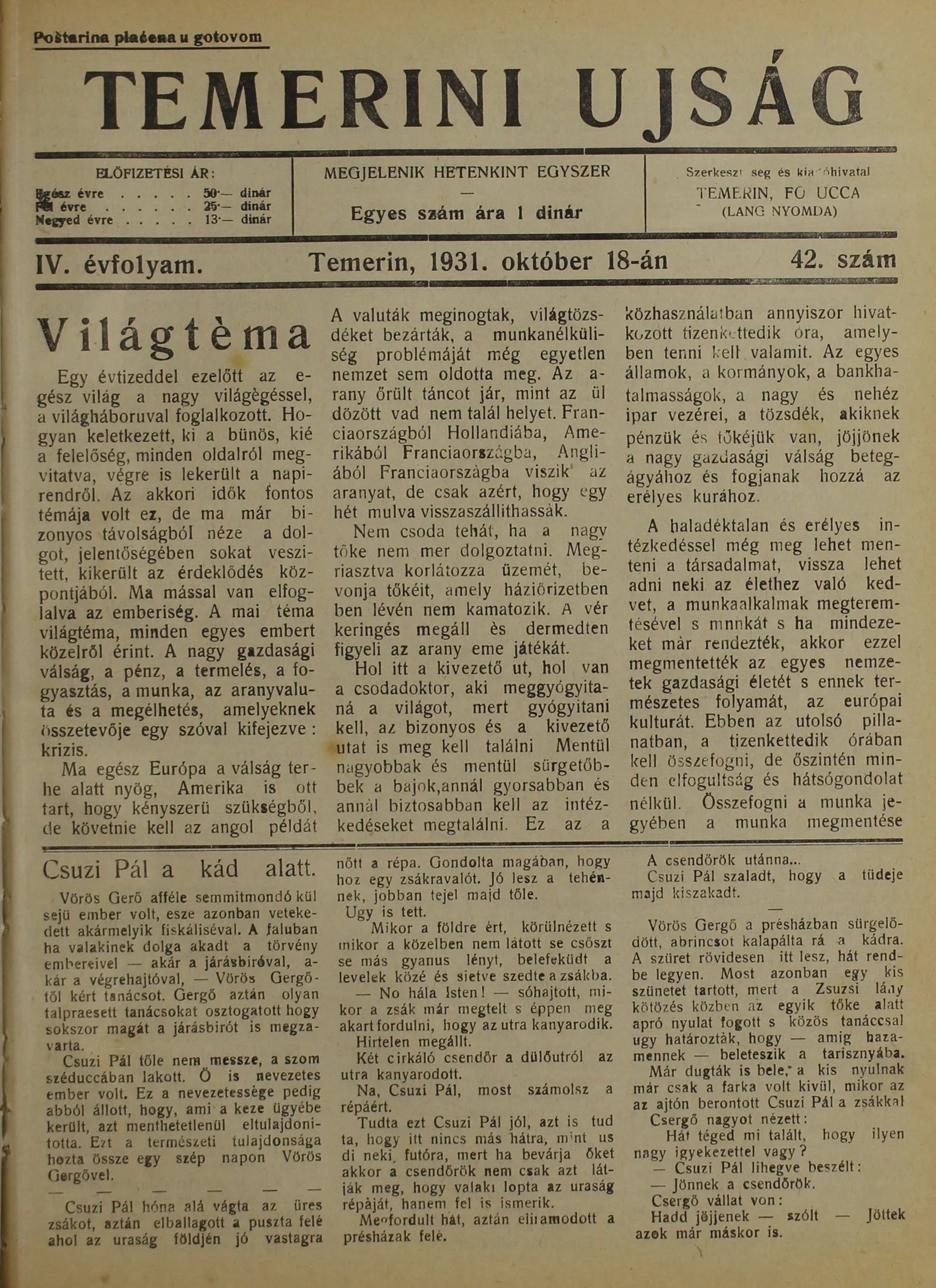 Temerini Újság 1928-1944, 4. évf. 1931. október 18. 42. sz.