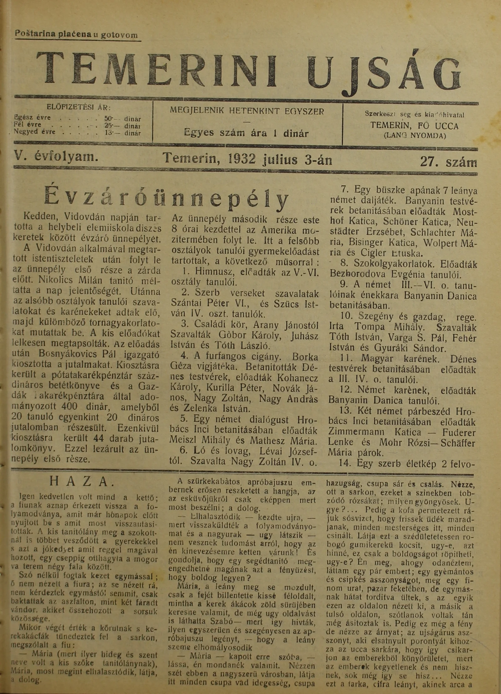 Temerini Újság 1928-1944, 5. évf. 1932. július 3. 27. sz.