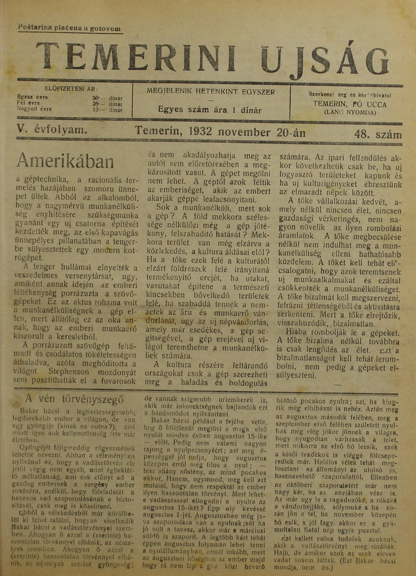 Temerini Újság 1928-1944, 5. évf. 1932. november 20. 48. sz.