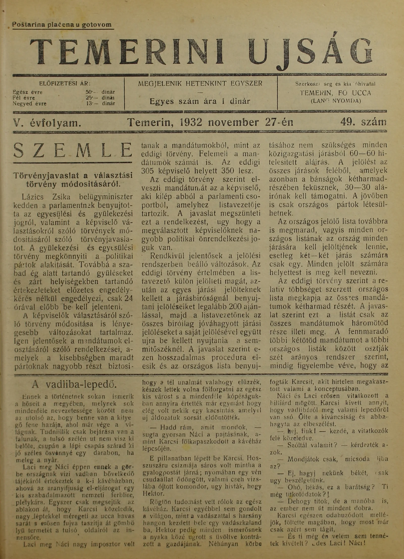 Temerini Újság 1928-1944, 5. évf. 1932. november 27. 49. sz.