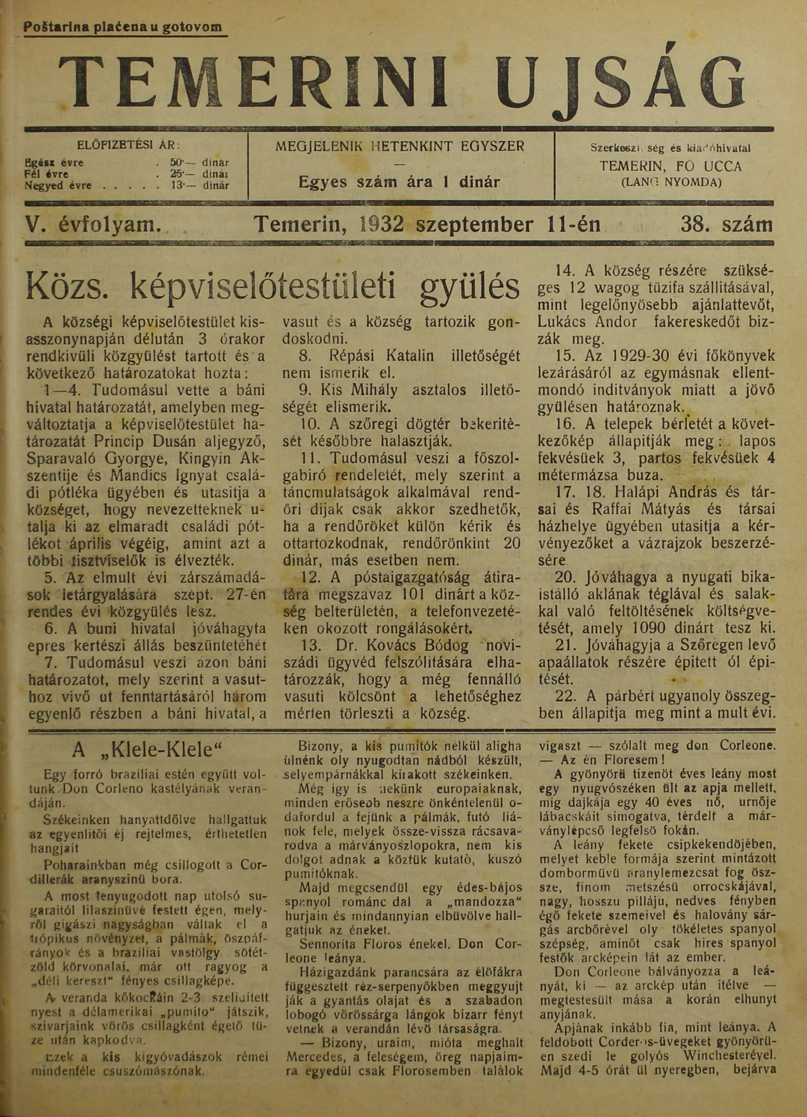Temerini Újság 1928-1944, 5. évf. 1932. szeptember 11. 38. sz.