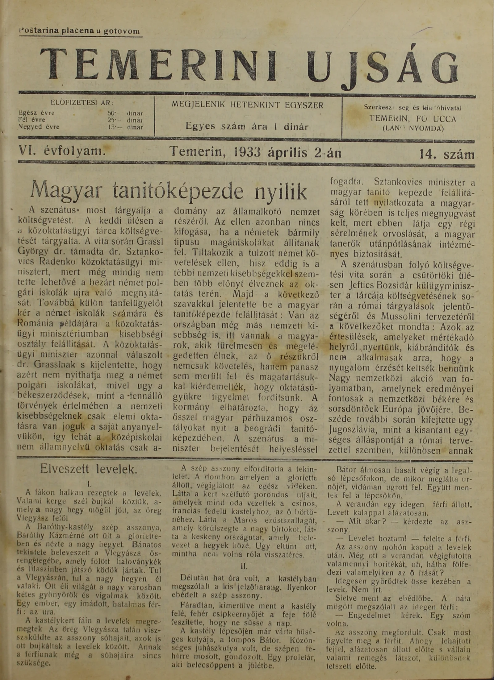 Temerini Újság 1928-1944, 6. évf. 1933. április 2. 14. sz.