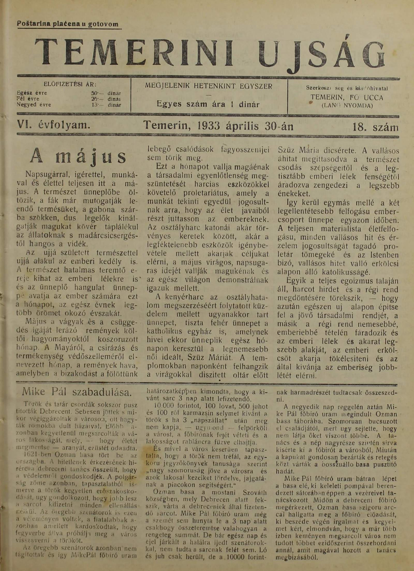 Temerini Újság 1928-1944, 6. évf. 1933. április 30. 18. sz.