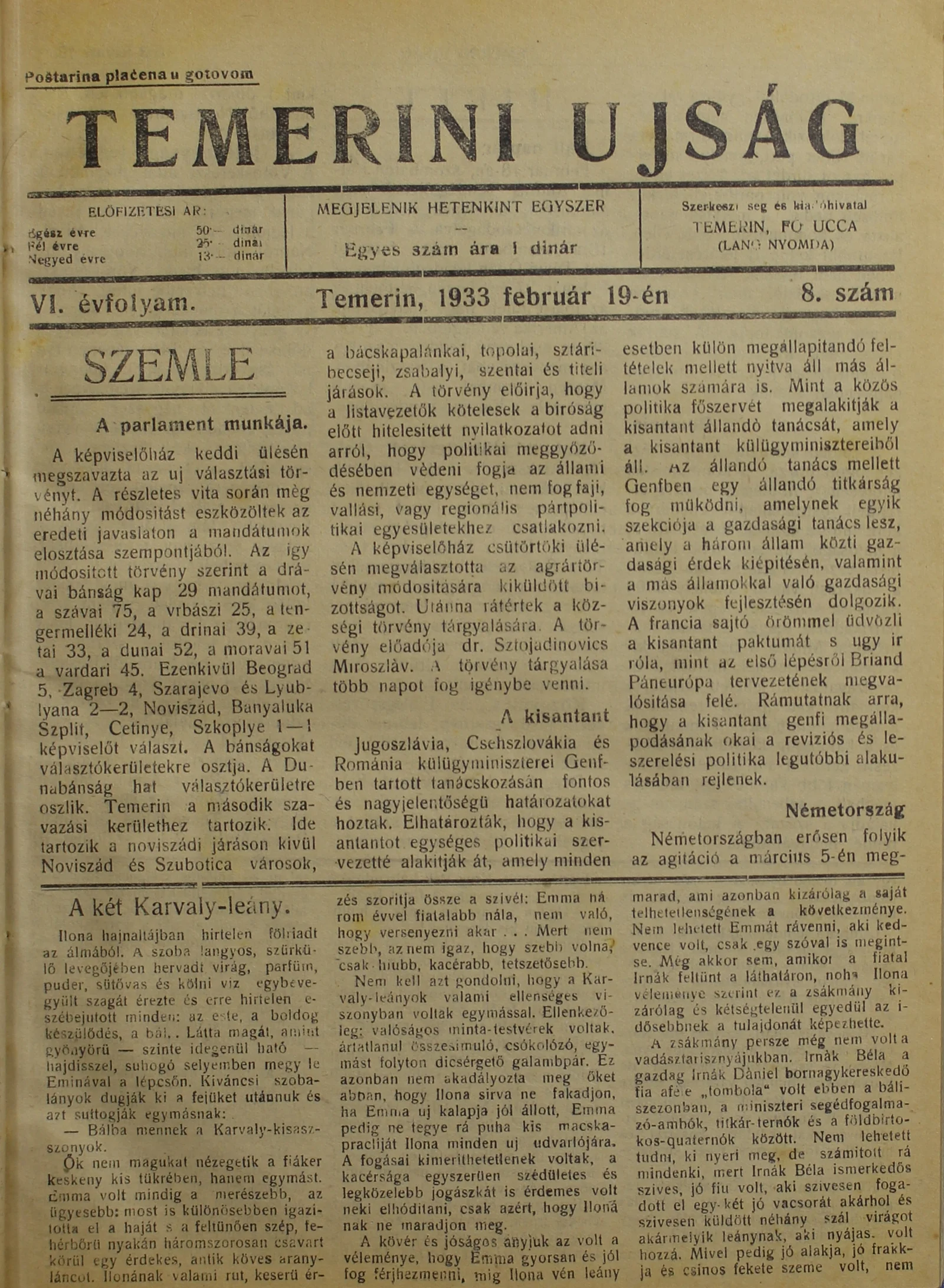 Temerini Újság 1928-1944, 6. évf. 1933. február 19. 8. sz.