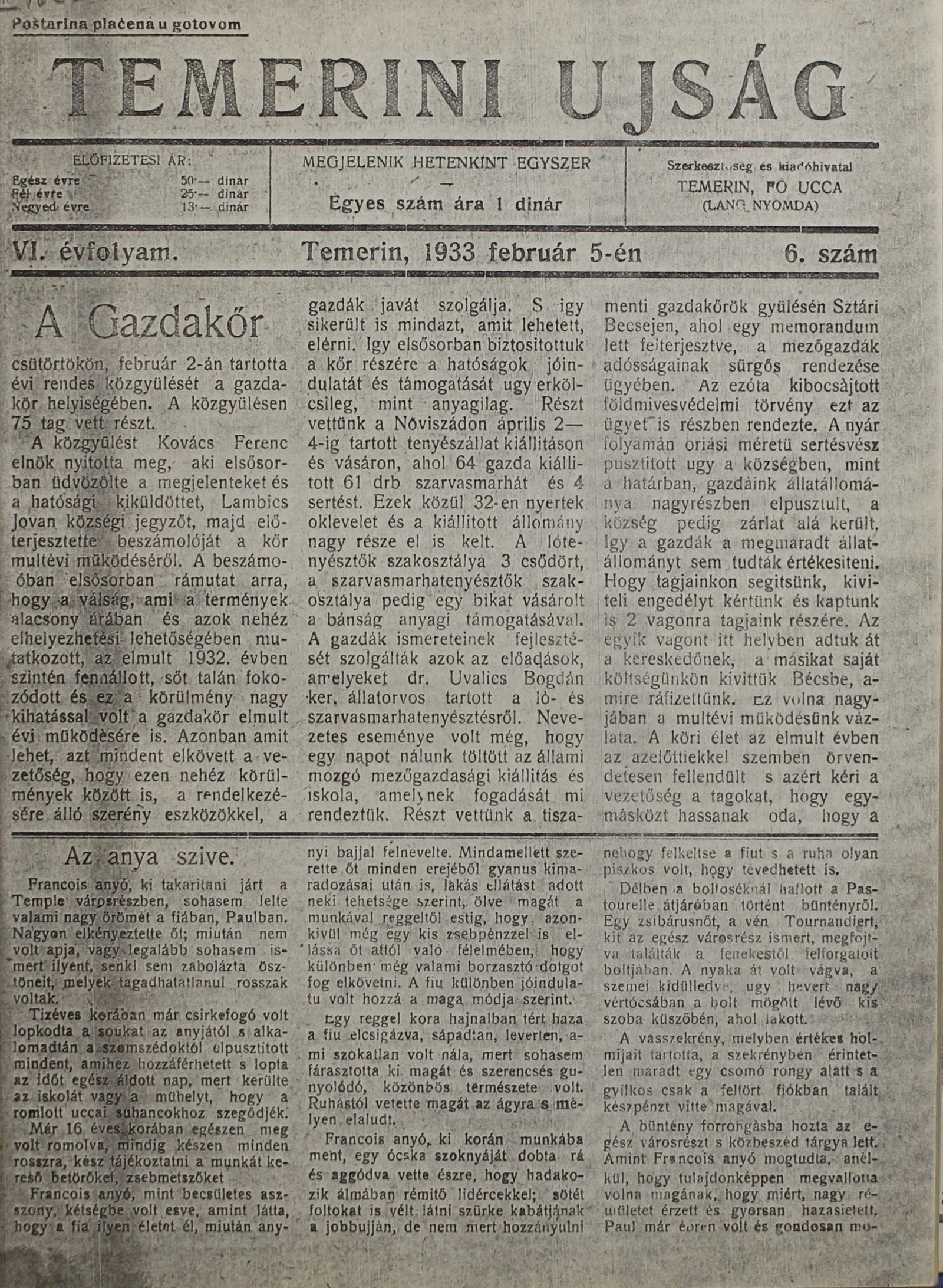 Temerini Újság 1928-1944, 6. évf. 1933. február 5. 6. sz.