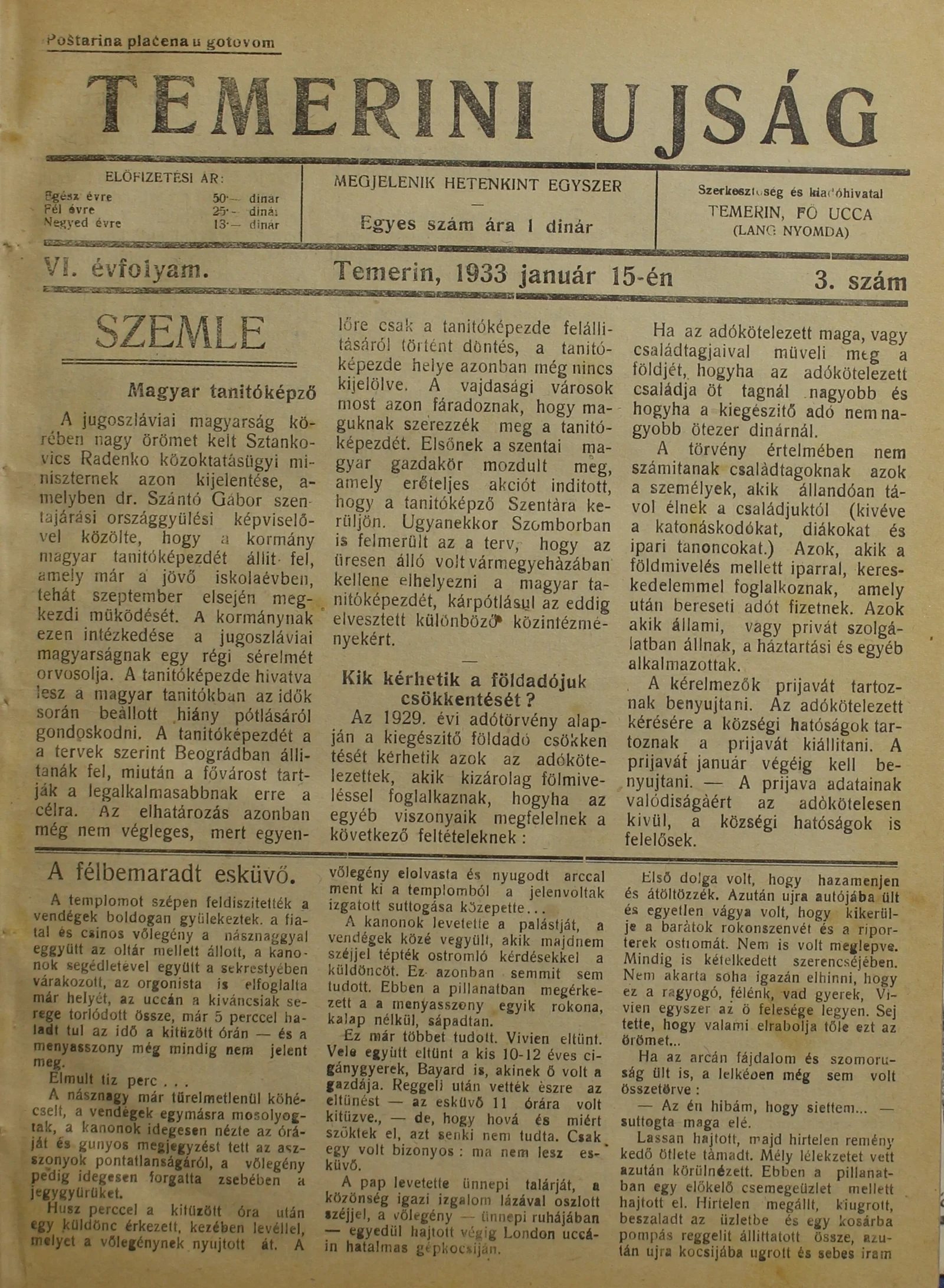Temerini Újság 1928-1944, 6. évf. 1933. január 15. 3. sz.