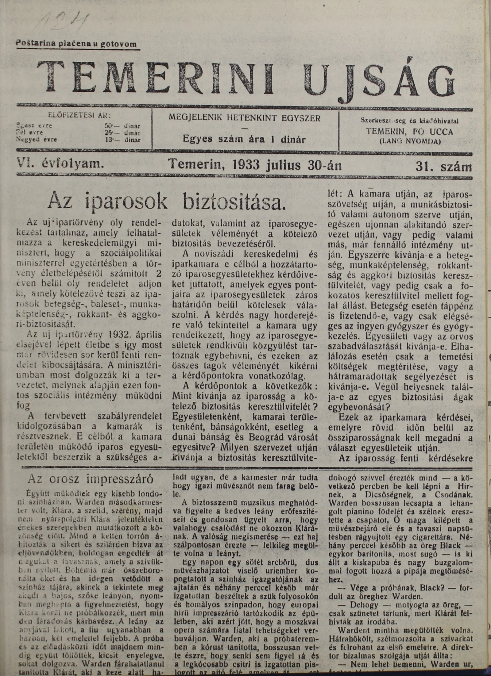 Temerini Újság 1928-1944, 6. évf. 1933. július 30. 31. sz.