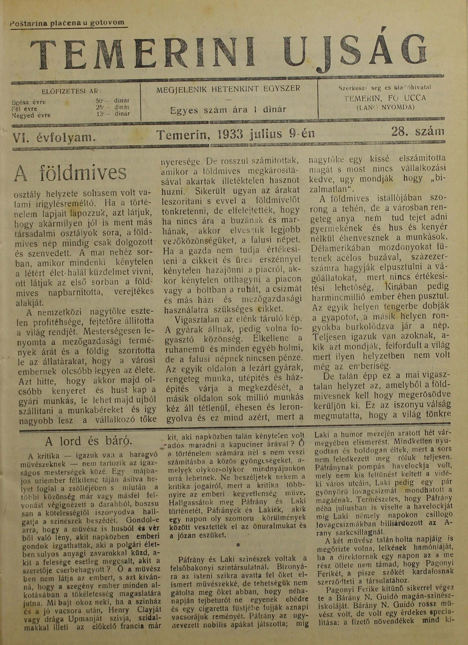 Temerini Újság 1928-1944, 6. évf. 1933. július 9. 28. sz.