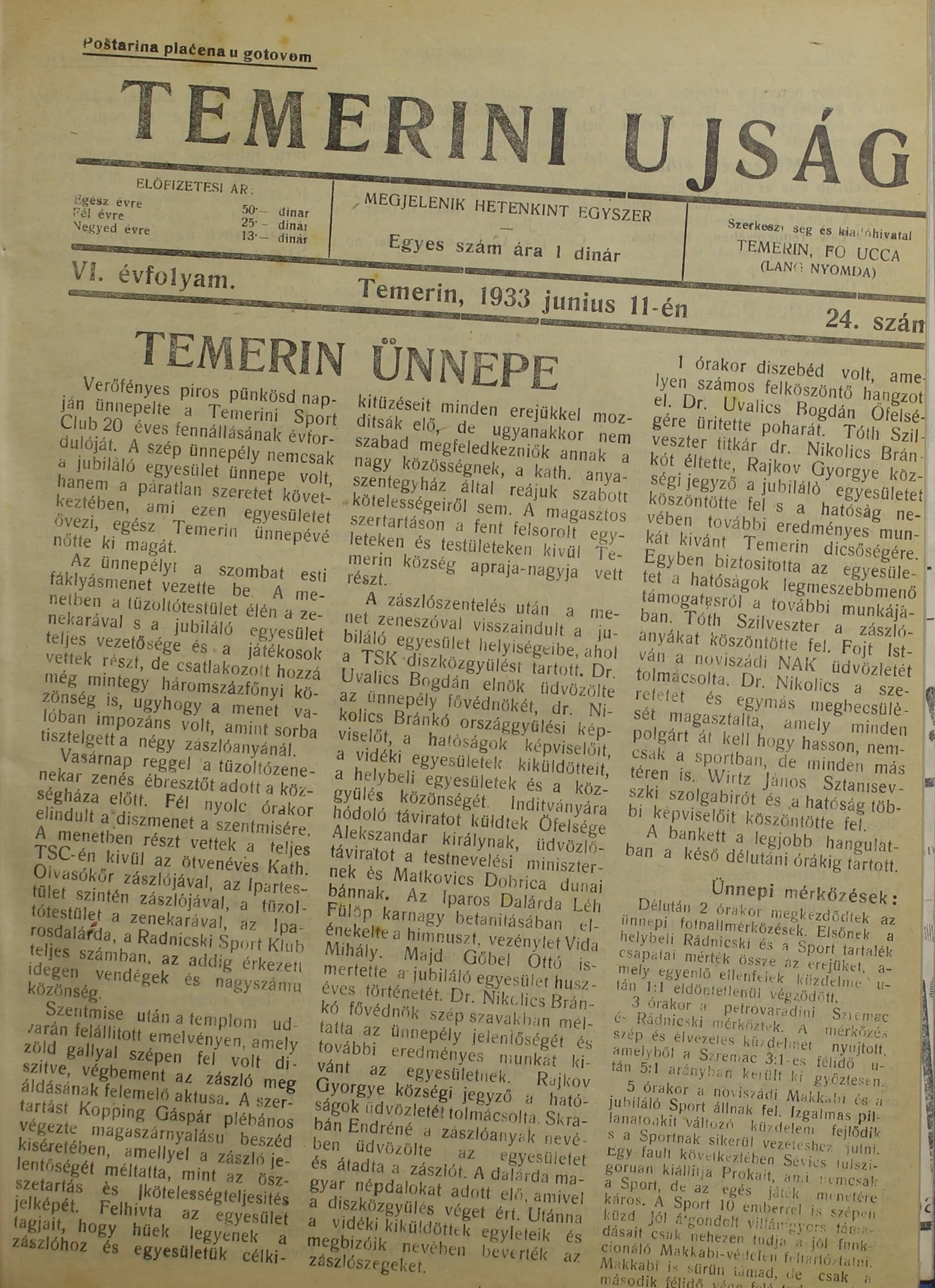 Temerini Újság 1928-1944, 6. évf. 1933. június 11. 24. sz.