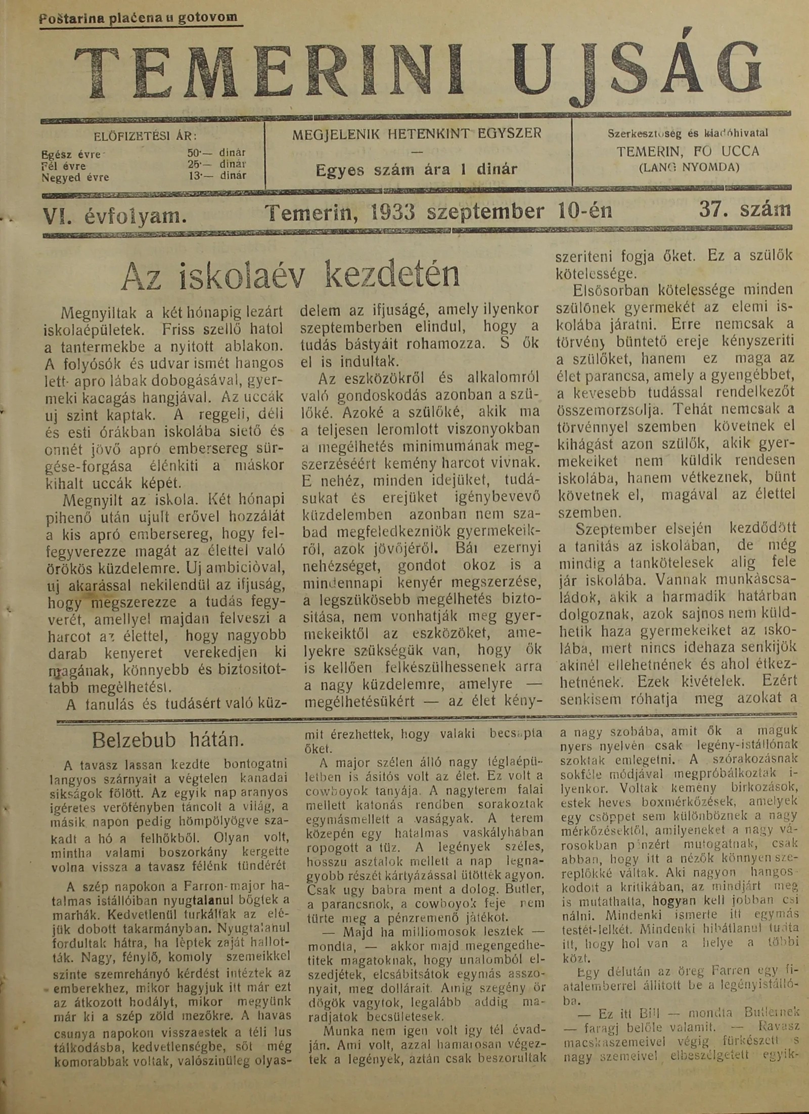 Temerini Újság 1928-1944, 6. évf. 1933. szeptember 10. 37. sz.