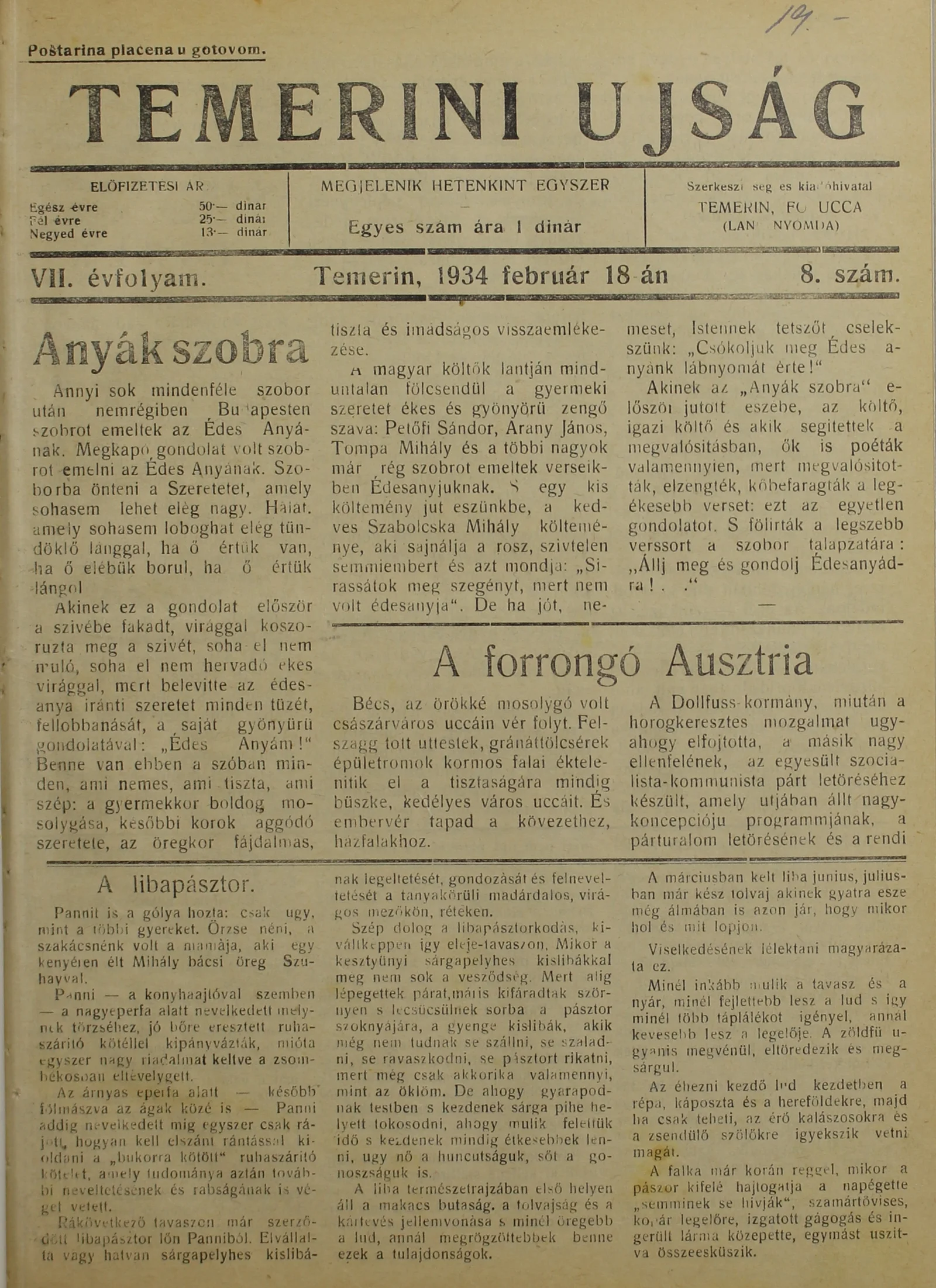 Temerini Újság 1928-1944, 7. évf. 1934. február 18. 8. sz.