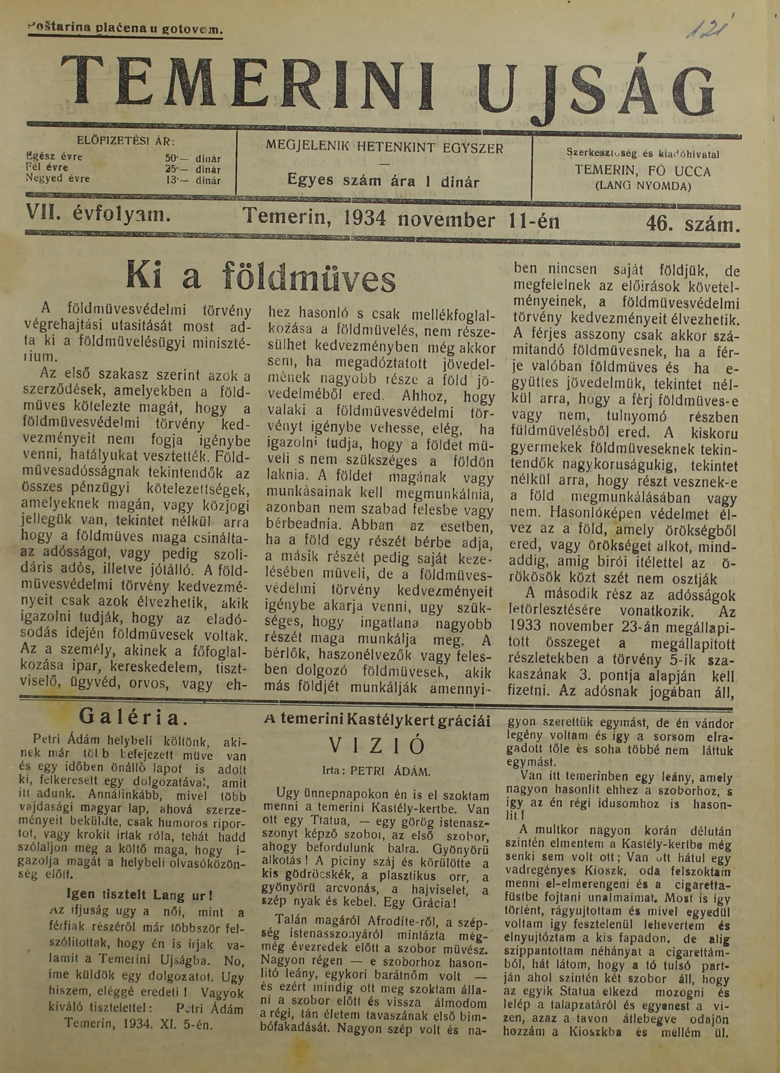 Temerini Újság 1928-1944, 7. évf. 1934. november 11. 46. sz.