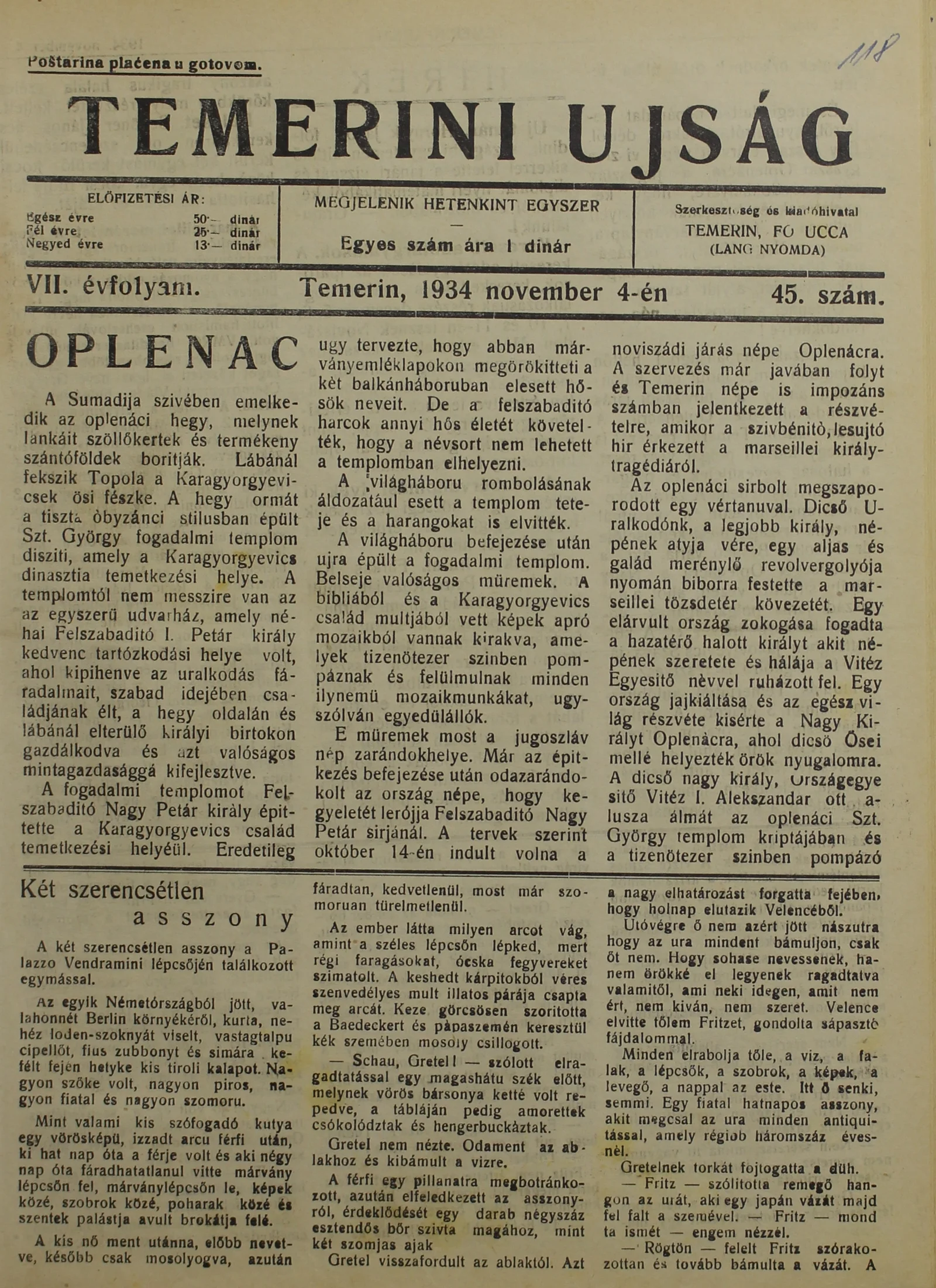 Temerini Újság 1928-1944, 7. évf. 1934. november 4. 45. sz.