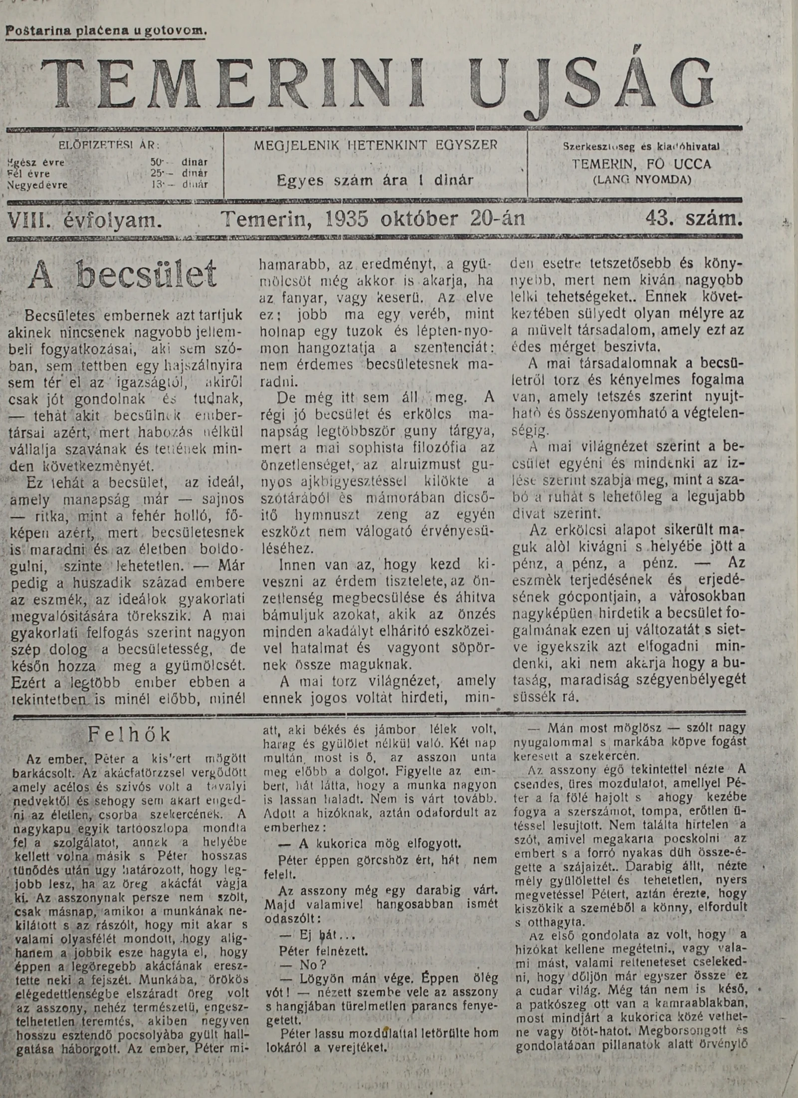 Temerini Újság 1928-1944, 8. évf. 1935. október 20. 43. sz.