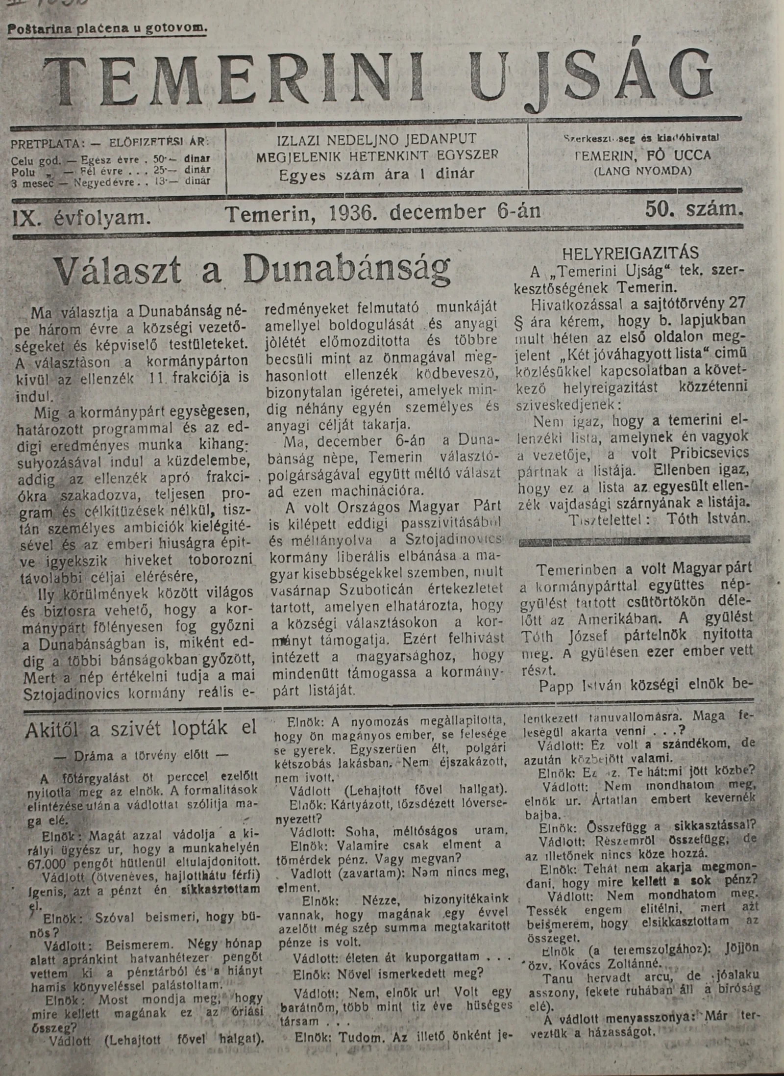 Temerini Újság 1928-1944, 9. évf. 1936. december 6. 50. sz.