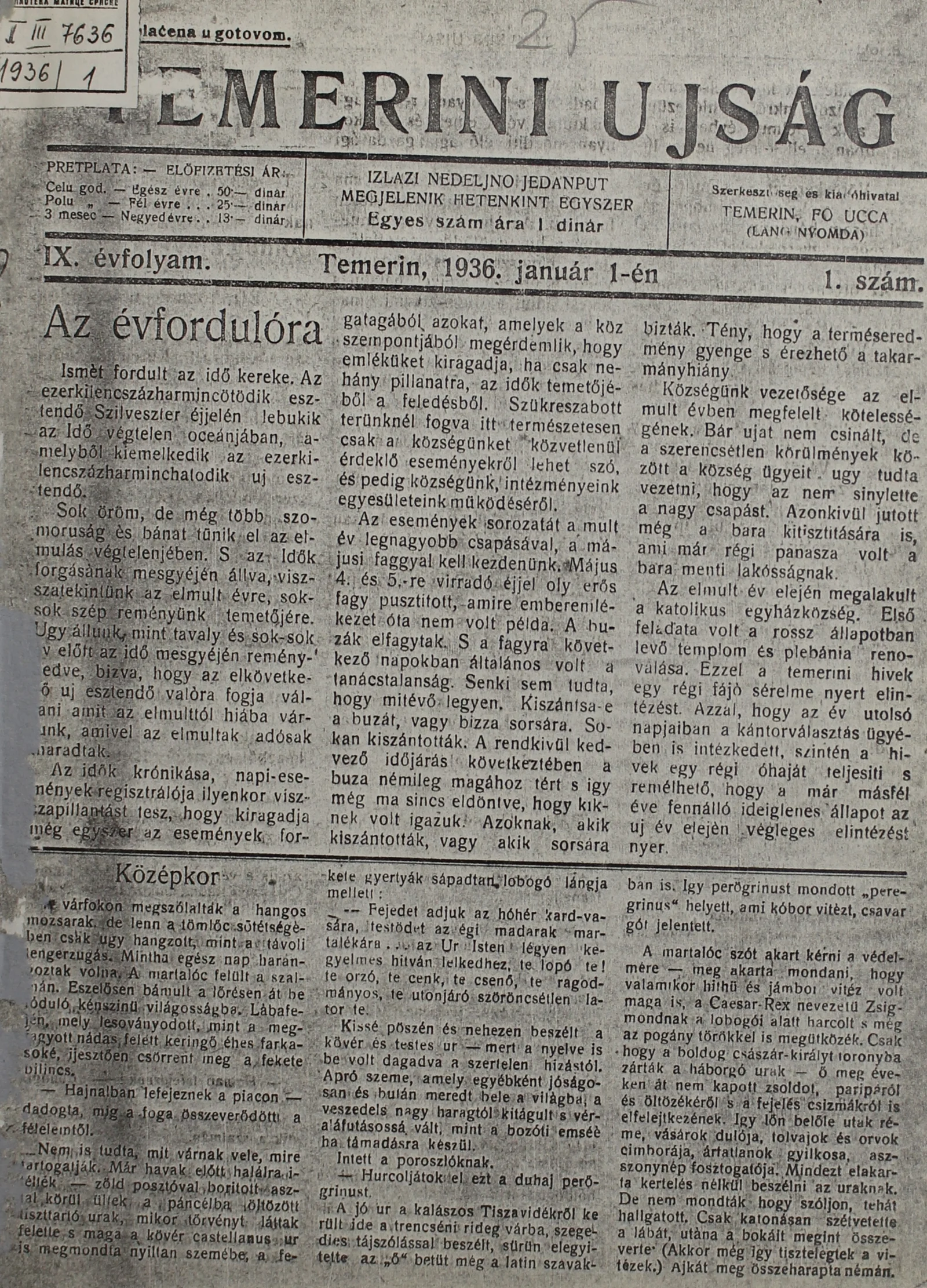 Temerini Újság 1928-1944, 9. évf. 1936. január 1. 1. sz.