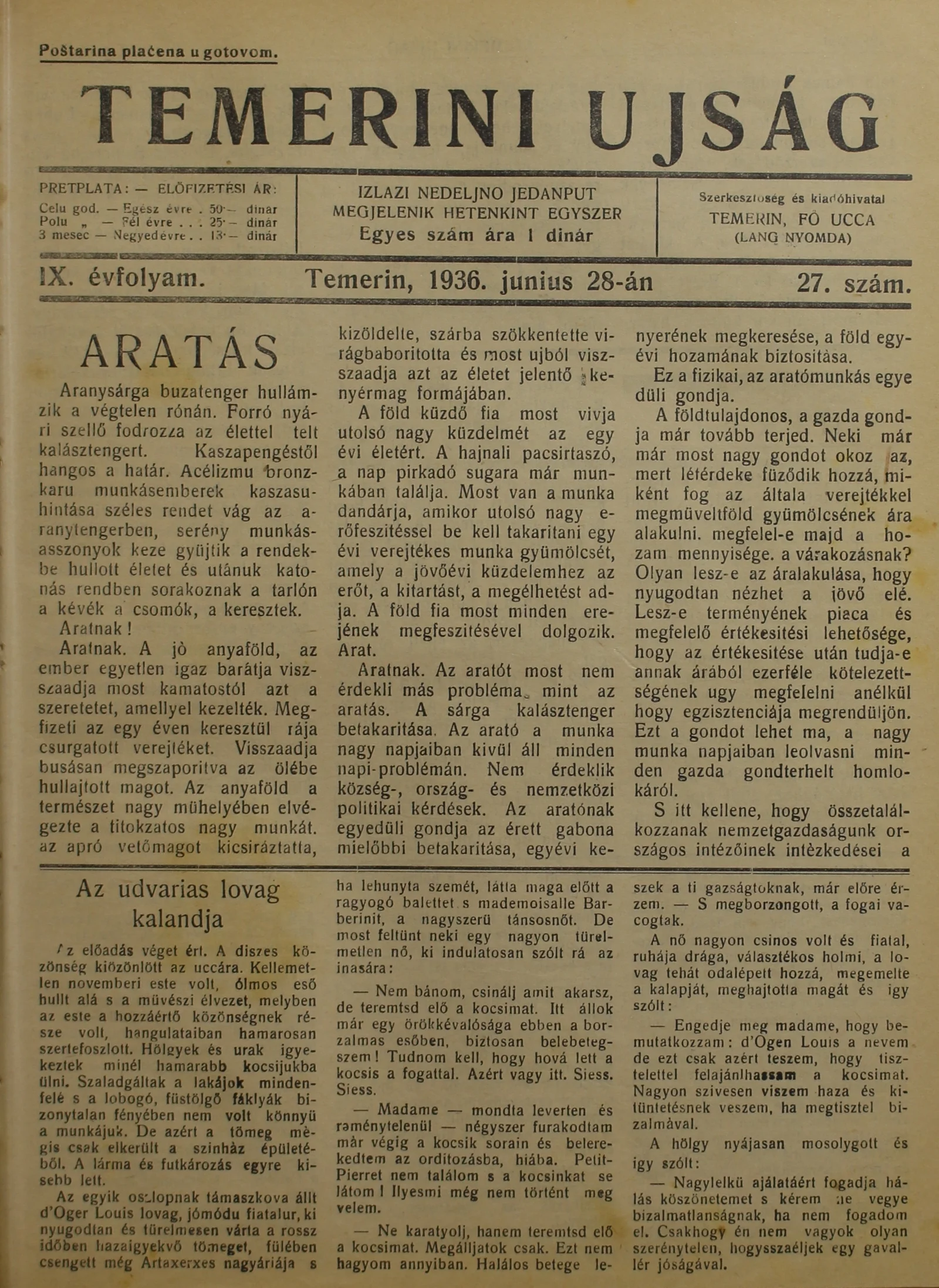 Temerini Újság 1928-1944, 9. évf. 1936. június 28. 27. sz.