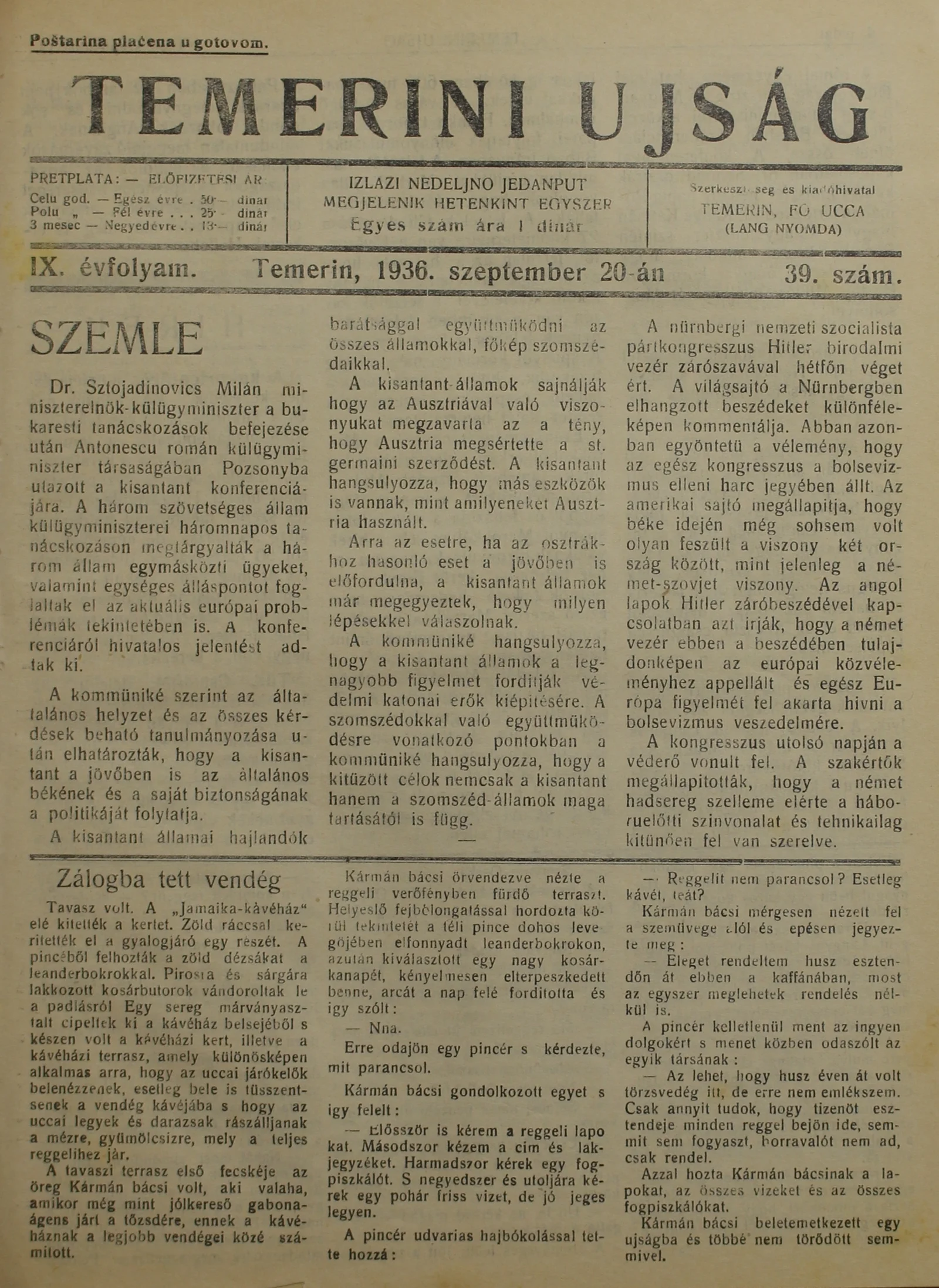 Temerini Újság 1928-1944, 9. évf. 1936. szeptember 20. 39. sz.
