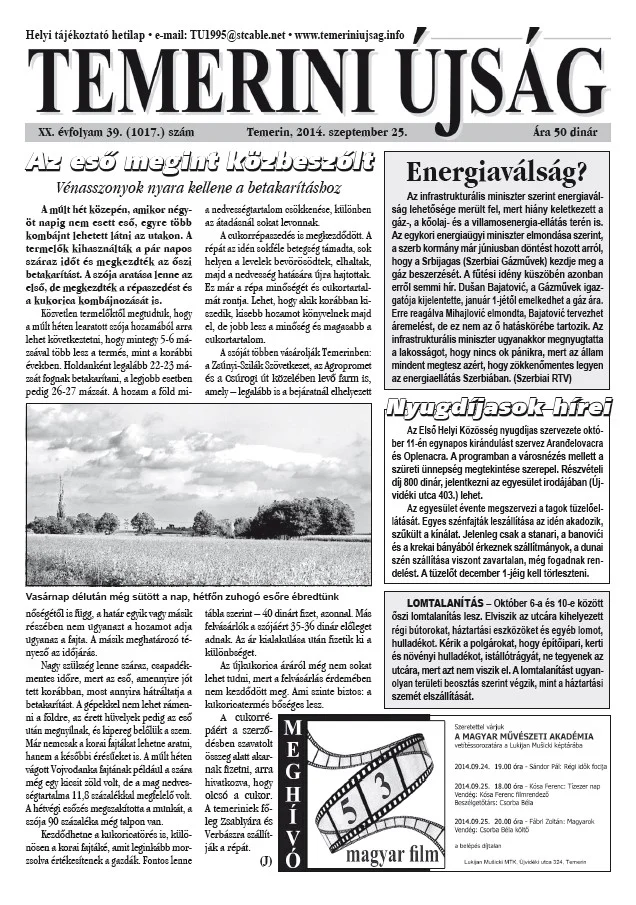 Temerini Újság, 20. évf. 2014. szeptember 25. 39. sz.
