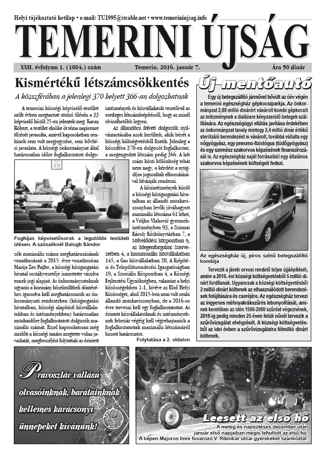 Temerini Újság, 22. évf. 2016. január 7. 1. sz.
