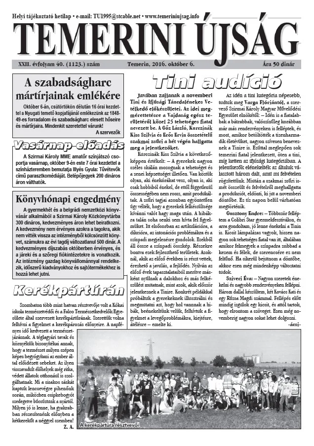 Temerini Újság, 22. évf. 2016. október 6. 40. sz.