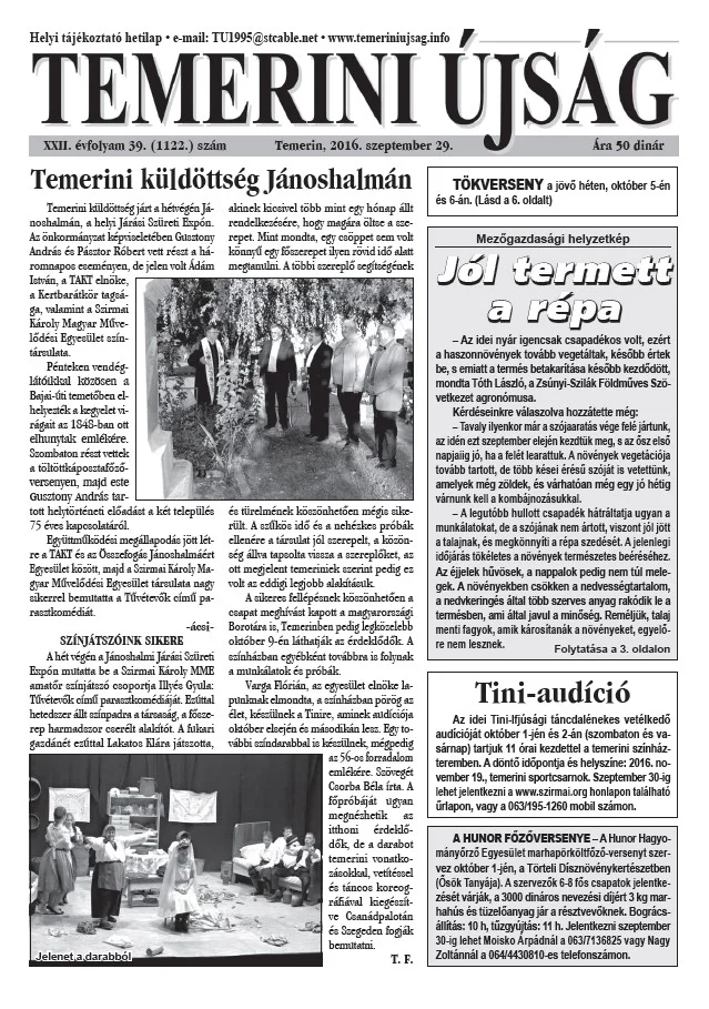 Temerini Újság, 22. évf. 2016. szeptember 29. 39. sz.