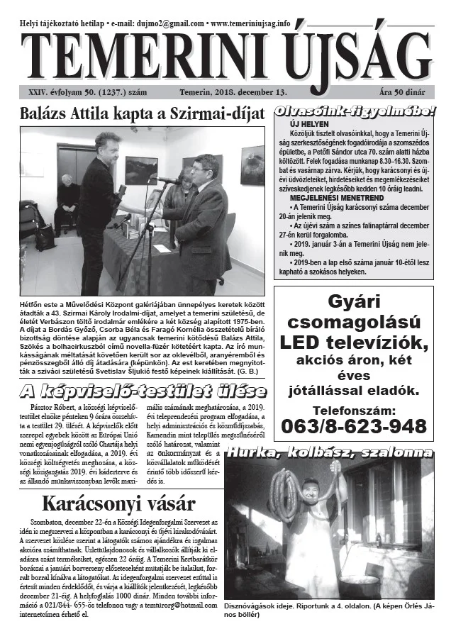Temerini Újság, 24. évf. 2018. december 13. 50. sz.