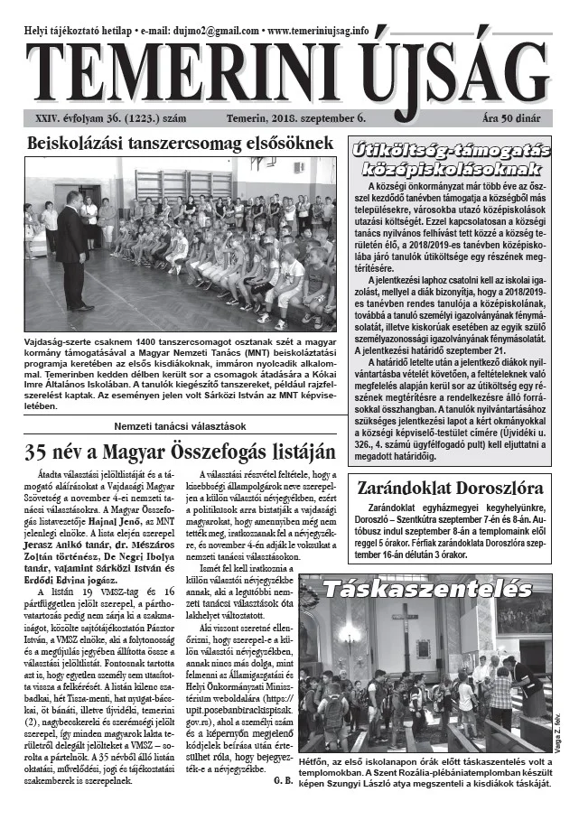 Temerini Újság, 24. évf. 2018. szeptember 6. 36. sz.