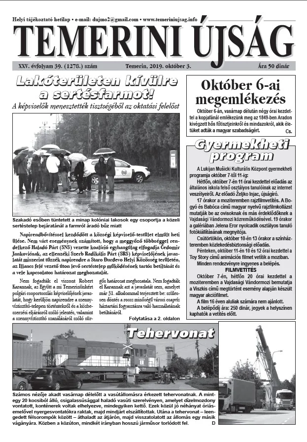 Temerini Újság, 25. évf. 2019. október 3. 39. sz.
