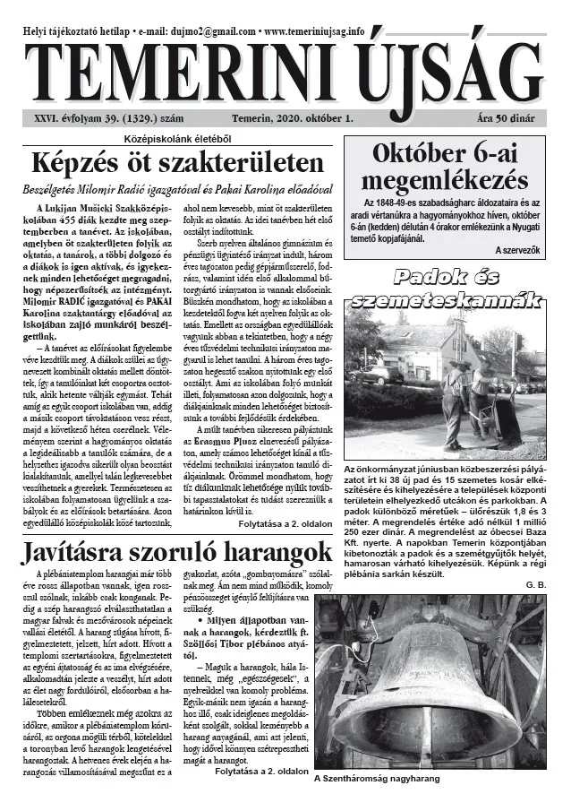 Temerini Újság, 26. évf. 2020. október 1. 39. sz.