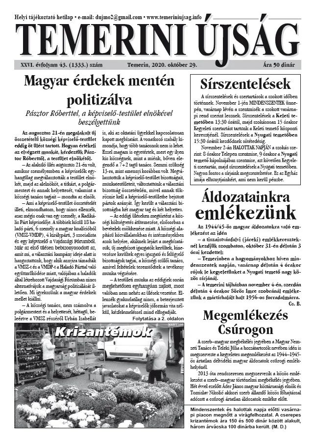 Temerini Újság, 26. évf. 2020. október 29. 43. sz.