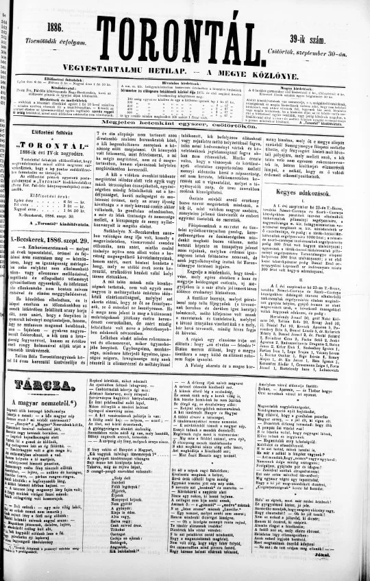 Torontál, 15. évf. 1886. szeptember 30. 39. sz.