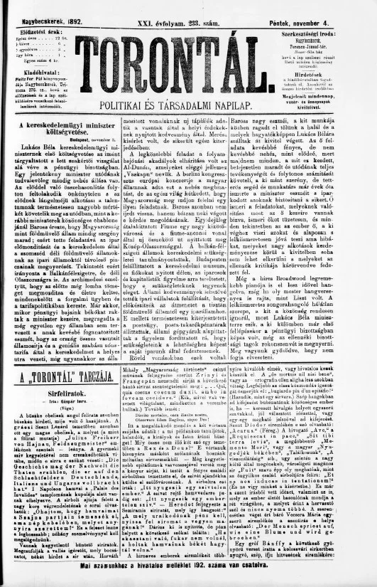 Torontál, 21. évf. 1892. november 4. 233. sz.