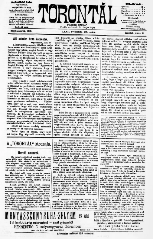 Torontál, 27. évf. 1898. június 18. 137. sz.