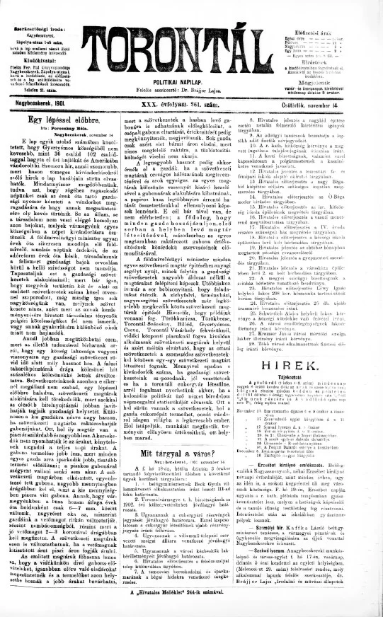 Torontál, 30. évf. 1901. november 14. 261. sz.