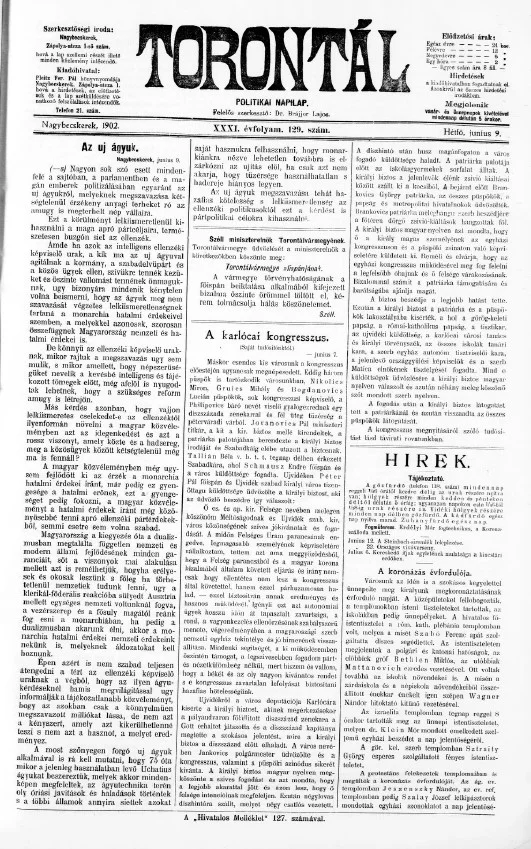 Torontál, 31. évf. 1902. június 9. 129. sz.