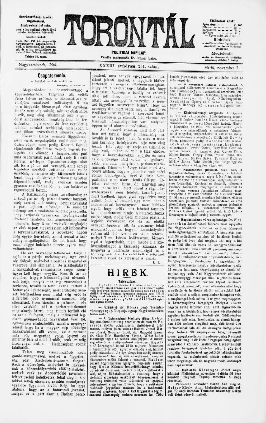 Torontál, 33. évf. 1904. november 7. 254. sz.
