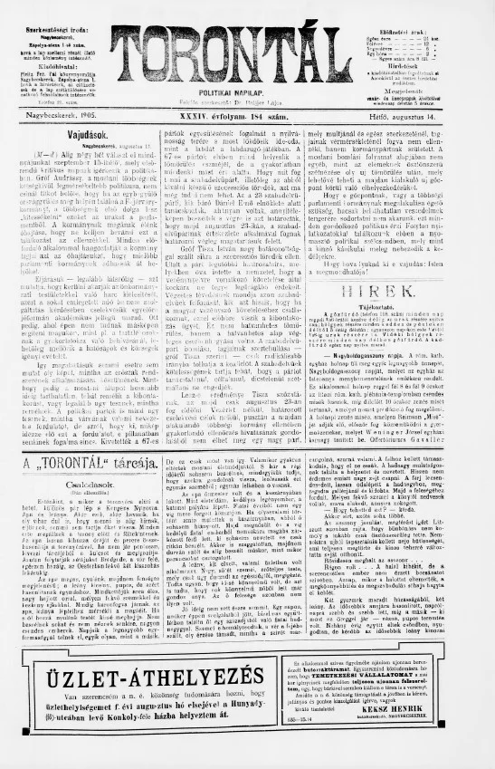 Torontál, 34. évf. 1905. augusztus 14. 184. sz.