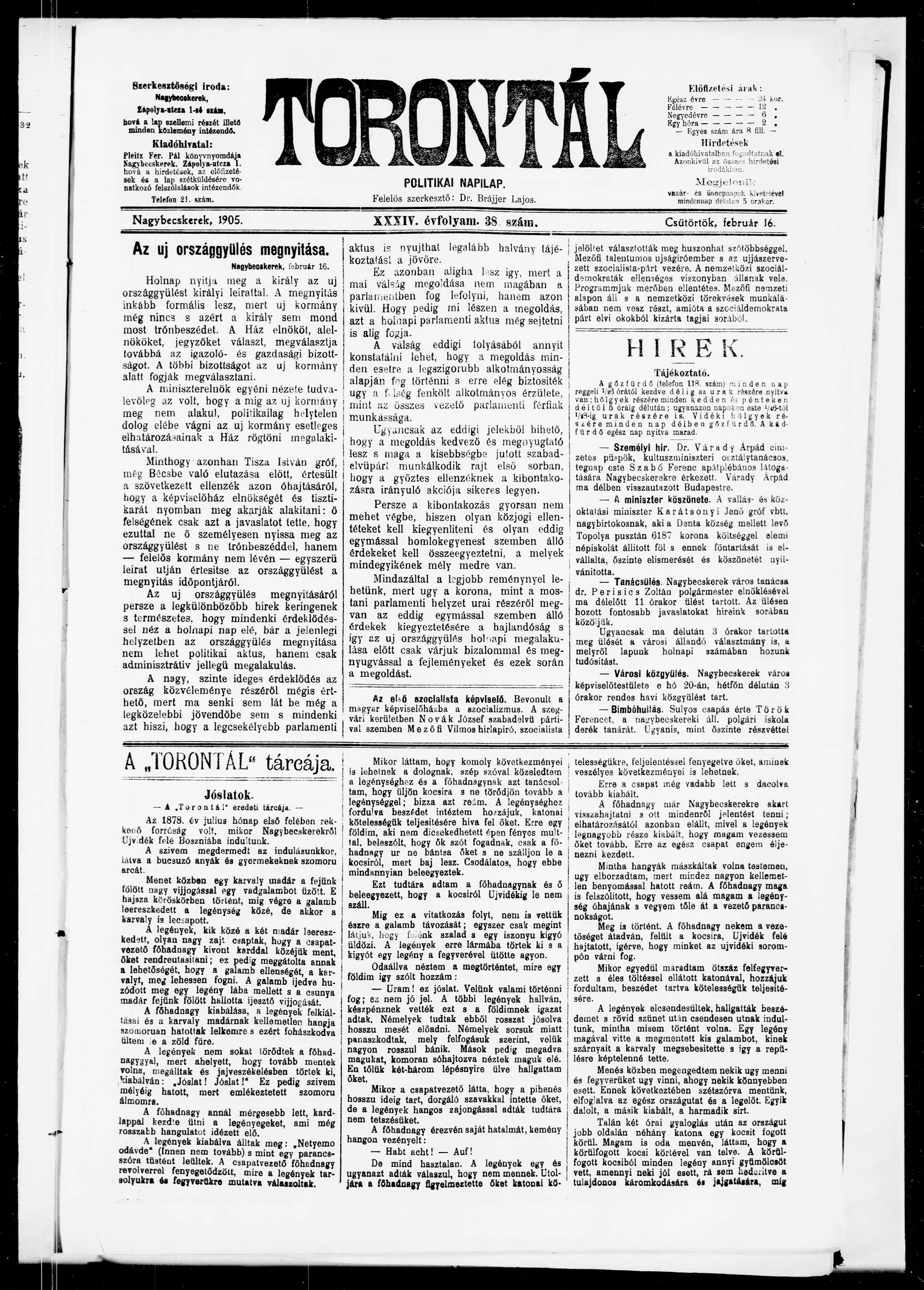 Torontál, 34. évf. 1905. február 16. 38. sz.